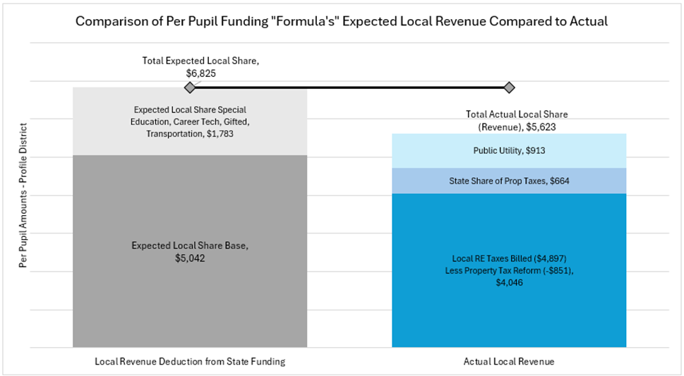 A structural deficit between formula-assumed and actual collectible local revenue shortchanges students. In the graph above, the profile district is at the state’s minimum local property tax rate (20 mills, to be eligible for state funding). The state’s formula assumes local revenue of $6,825, which exceeds the legally billable tax amount of $5,623 by about $1,200 (17%). Recently enacted property tax reform contributes to the $1,200 gap, as it reduces this district’s legally-billed local taxes by about $851. Rising assumed capacity vs. declining legal capacity is contradictory and contributes to the $1,200 structural imbalance in formula-assumed local revenue per pupil.