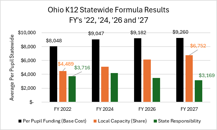 The formula is based upon a partnership between state funding and local funding. Calculated state revenue to schools begins with a per-pupil base cost to educate a student. The statewide average amount in FY 2027 is about $9,260. Base cost is then reduced by the formula-assumed local share of revenue. The remainder is then considered the state’s share of the per-pupil revenue - a higher local share decreases the state's share of revenue to schools.